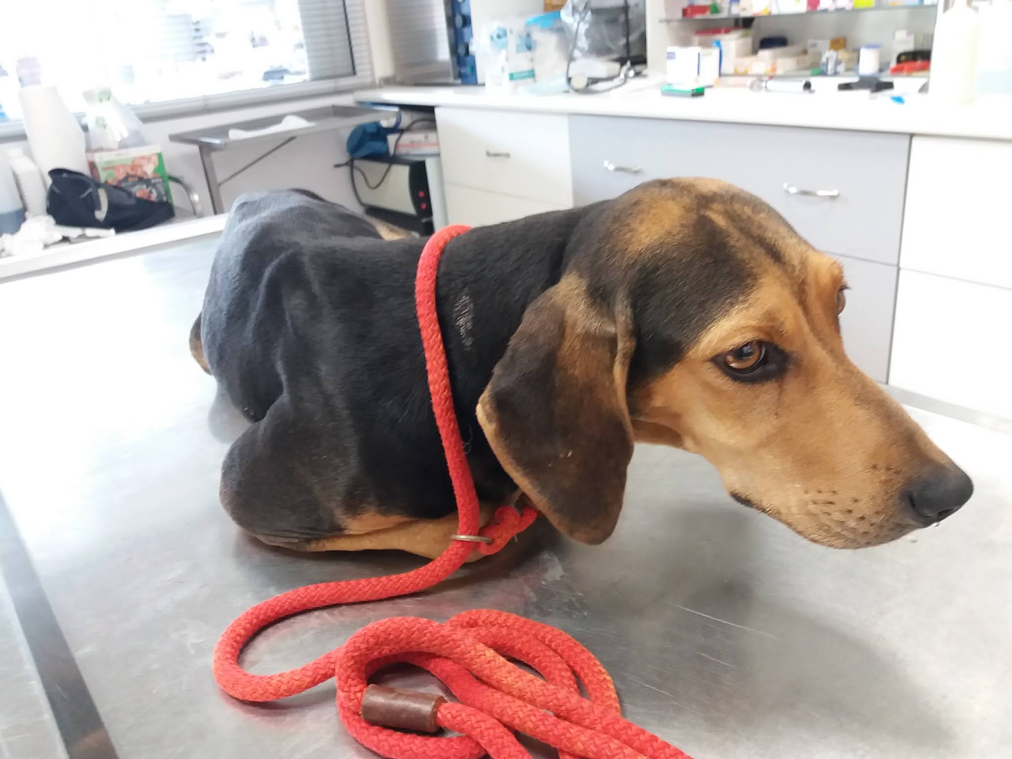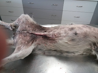 She was immediately checked by the vet, because she had an old big, deep wound on the inside of her back leg.